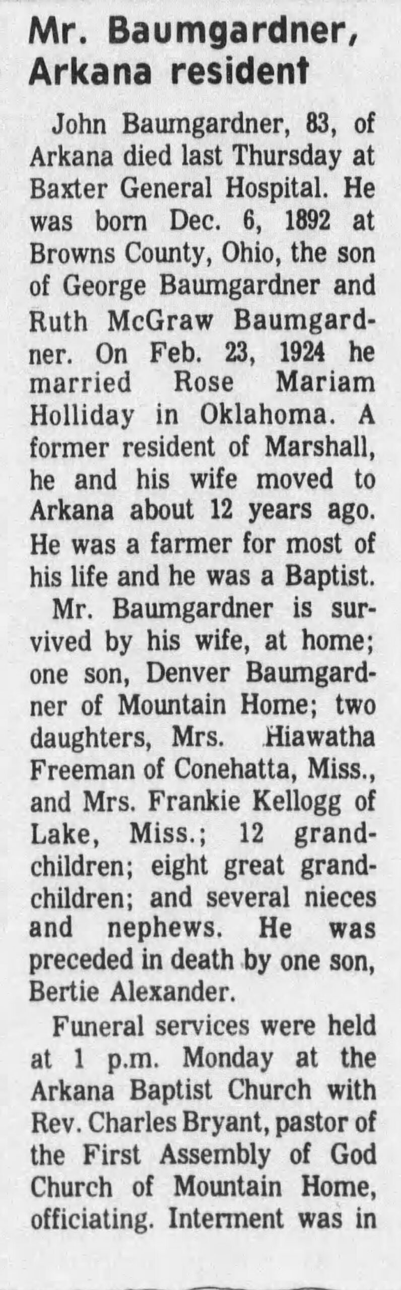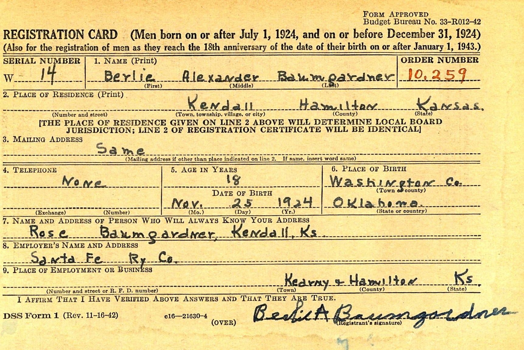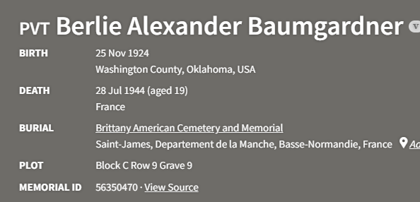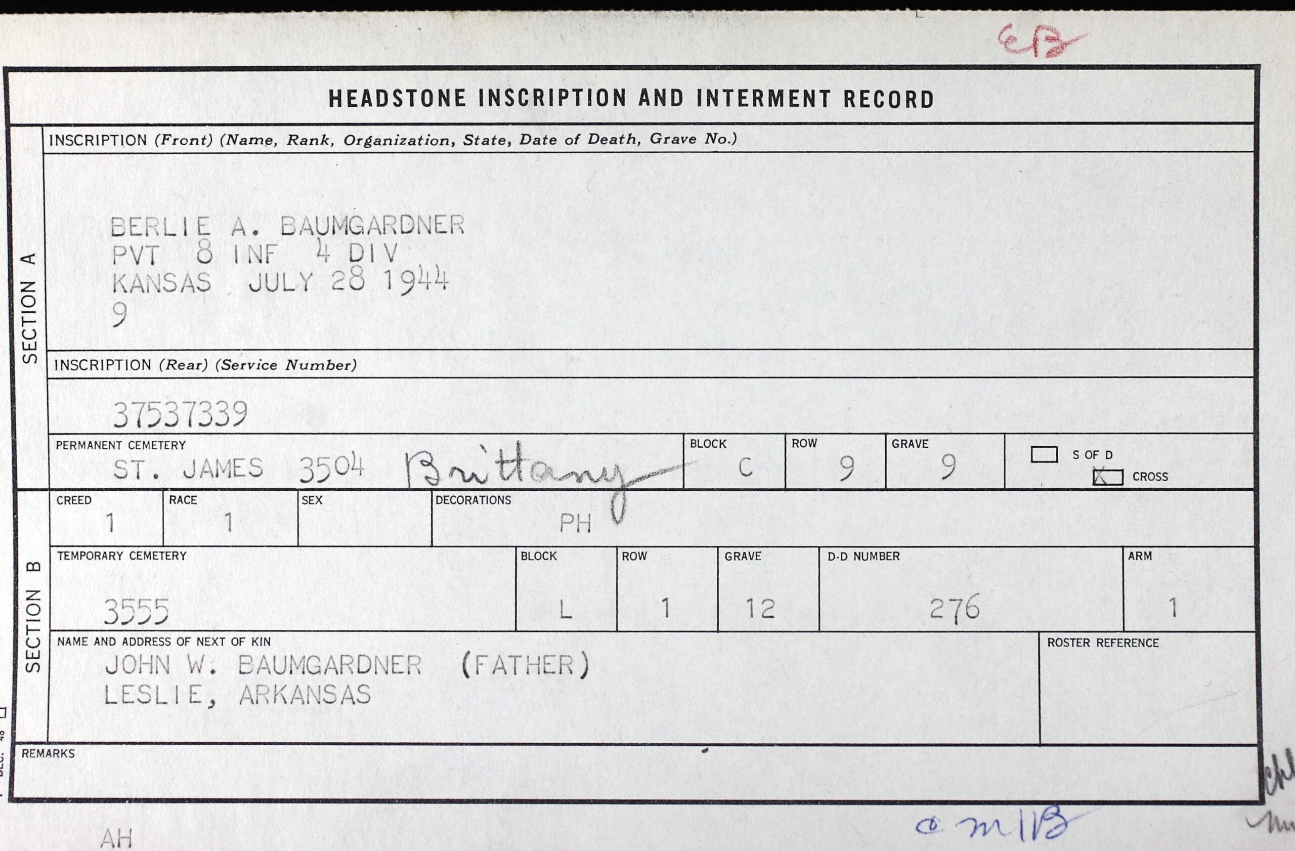 Berlie A. Baumgardner was born in Washington County, OK, on November 25, 1924, to parents John and Mary Baumgardner. Berlie was the eldest of four children, with one brother and two sisters. He enter the Army on July 3, 1943. He was killed in action on July 28, 1944. He was awarded a Purple Heart. (We have very limited information about this veteran. Any assistance you can provide, especially a photograph or additional details, would be greatly appreciated.)