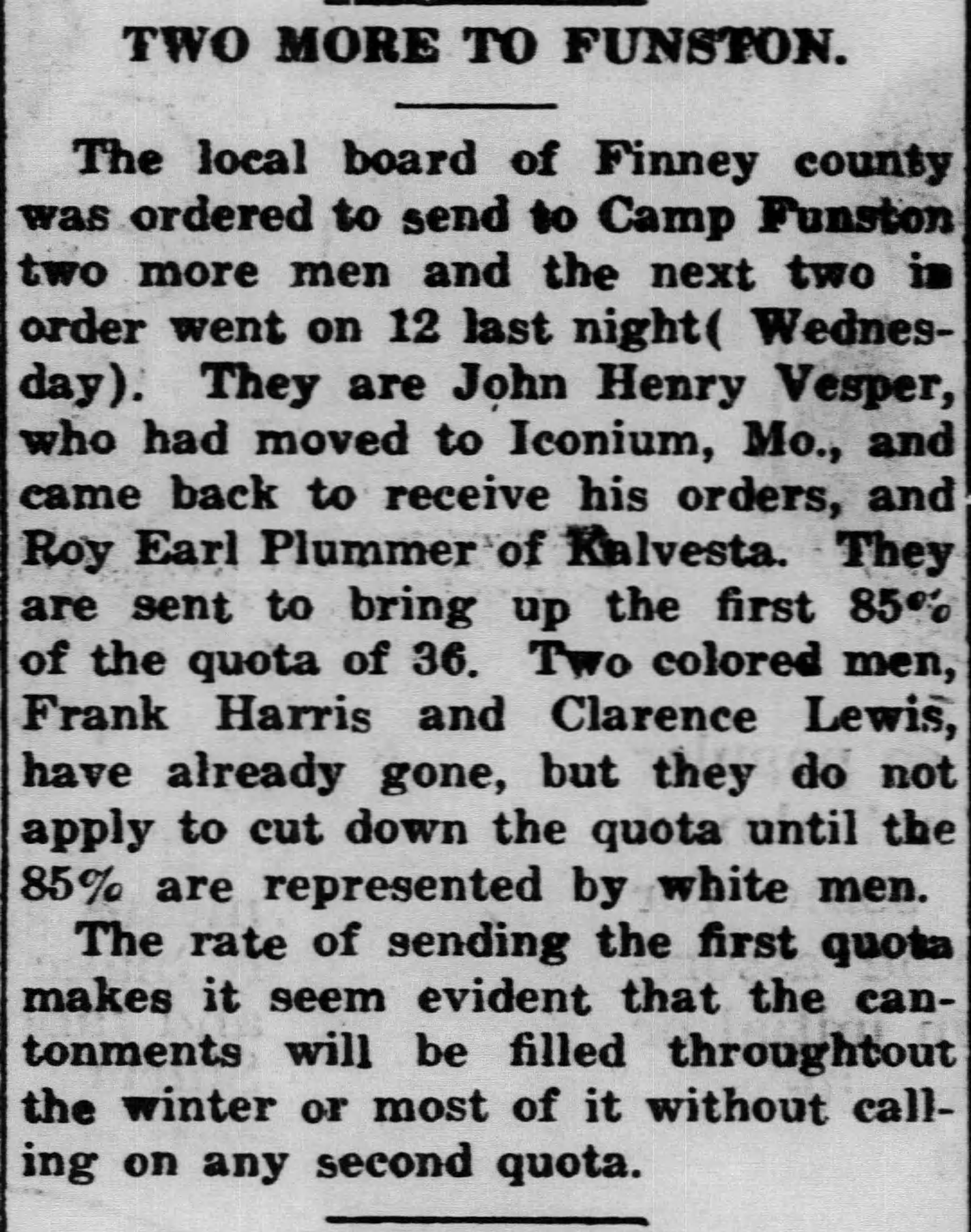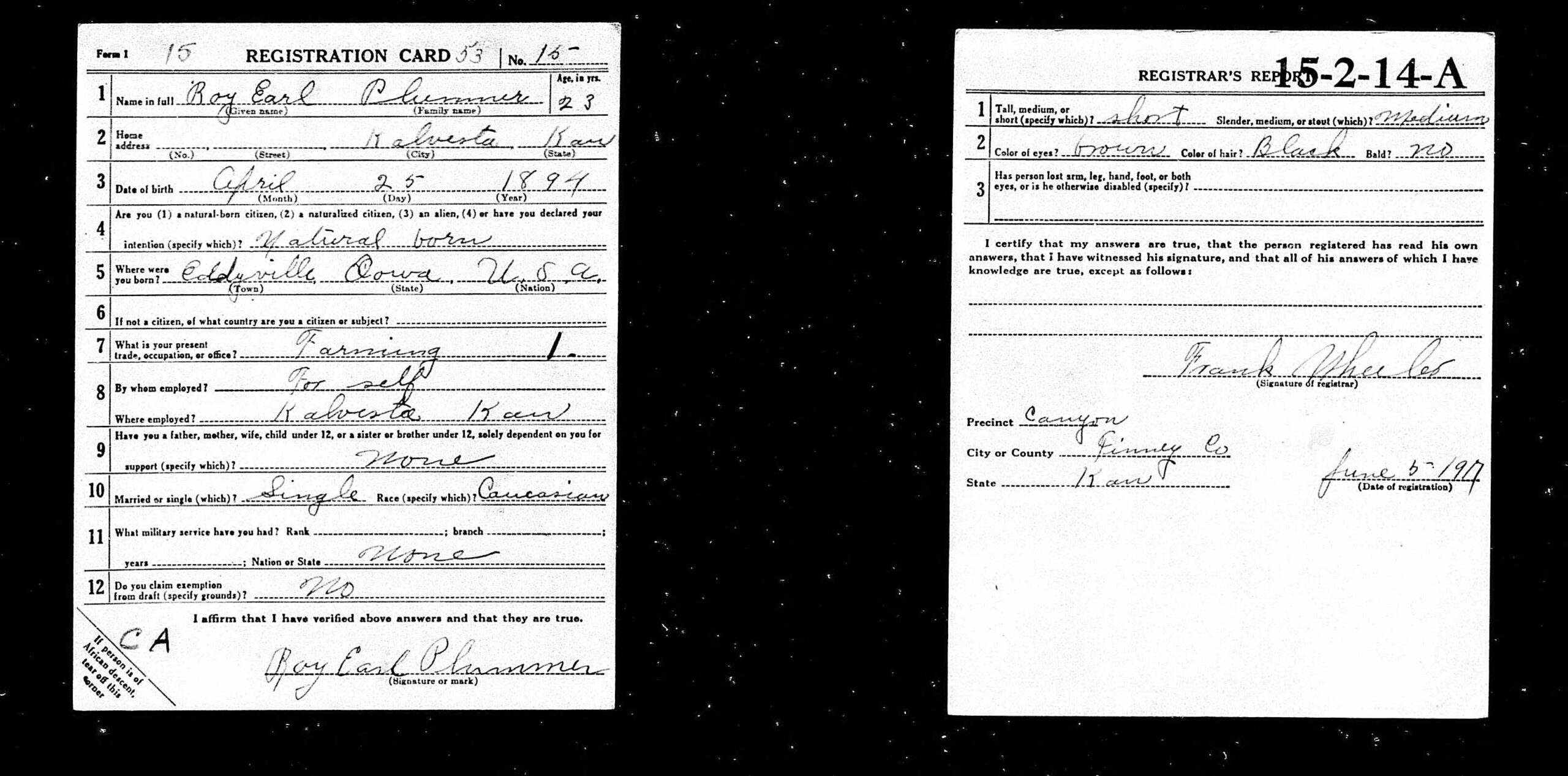 Roy Earl Plummer was born on April 25, 1894, in Iowa, his father, Sanford, was 34 and his mother, Nancy, was 29. He moved a few times during his lifetime. He lived in Columbia, Iowa, in 1900, Garfield, KS in 1915 and moved to Finney, Kansas, by 1917. In December of 1917 Roy was called by the local draft board (see newspaper article in gallery). At that time Roy lived in Kalvesta, Gray County, KS. Also, in June of 1917, when Roy filled out his registration Card, he listed his address as Kalvesta.